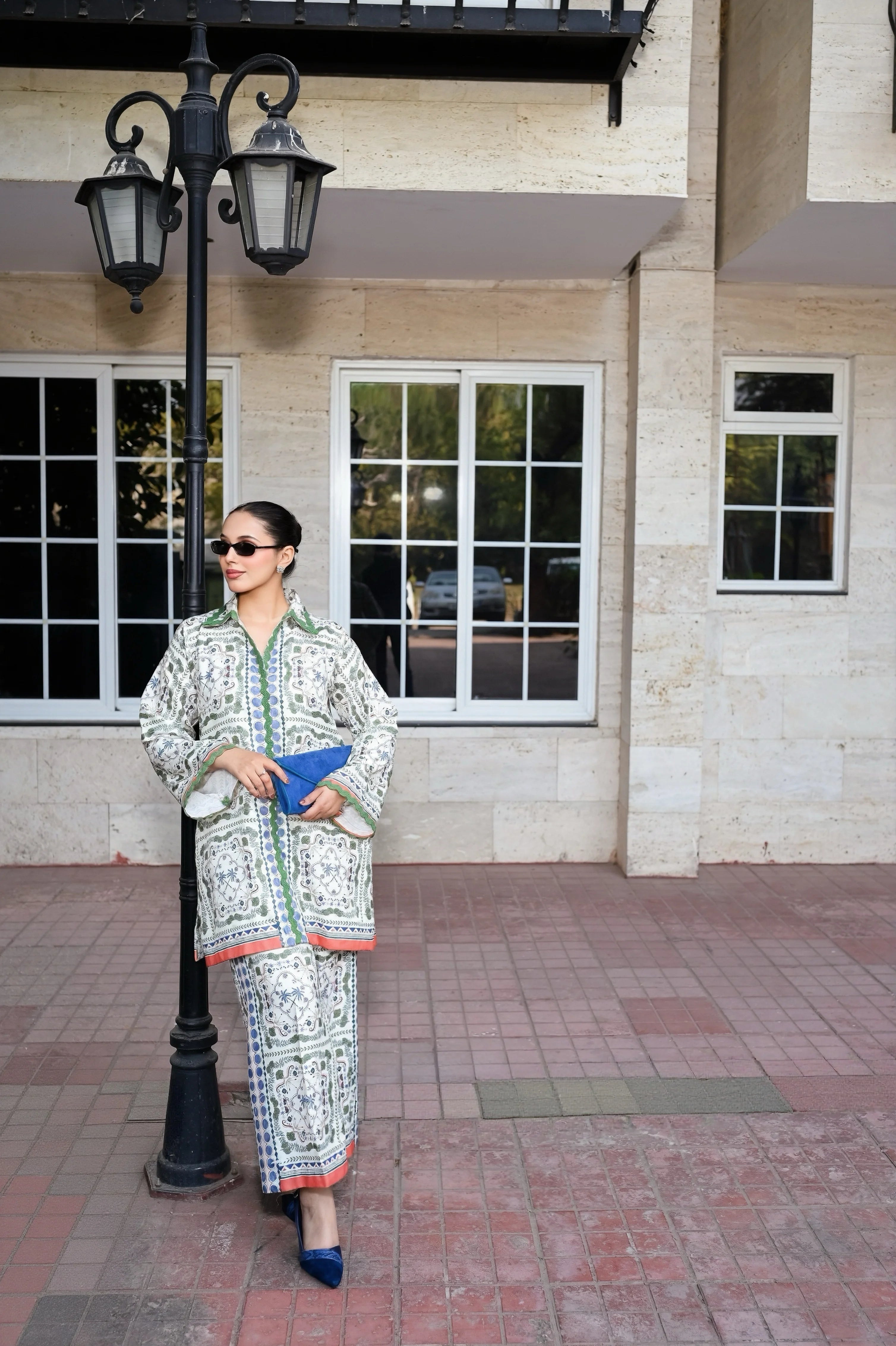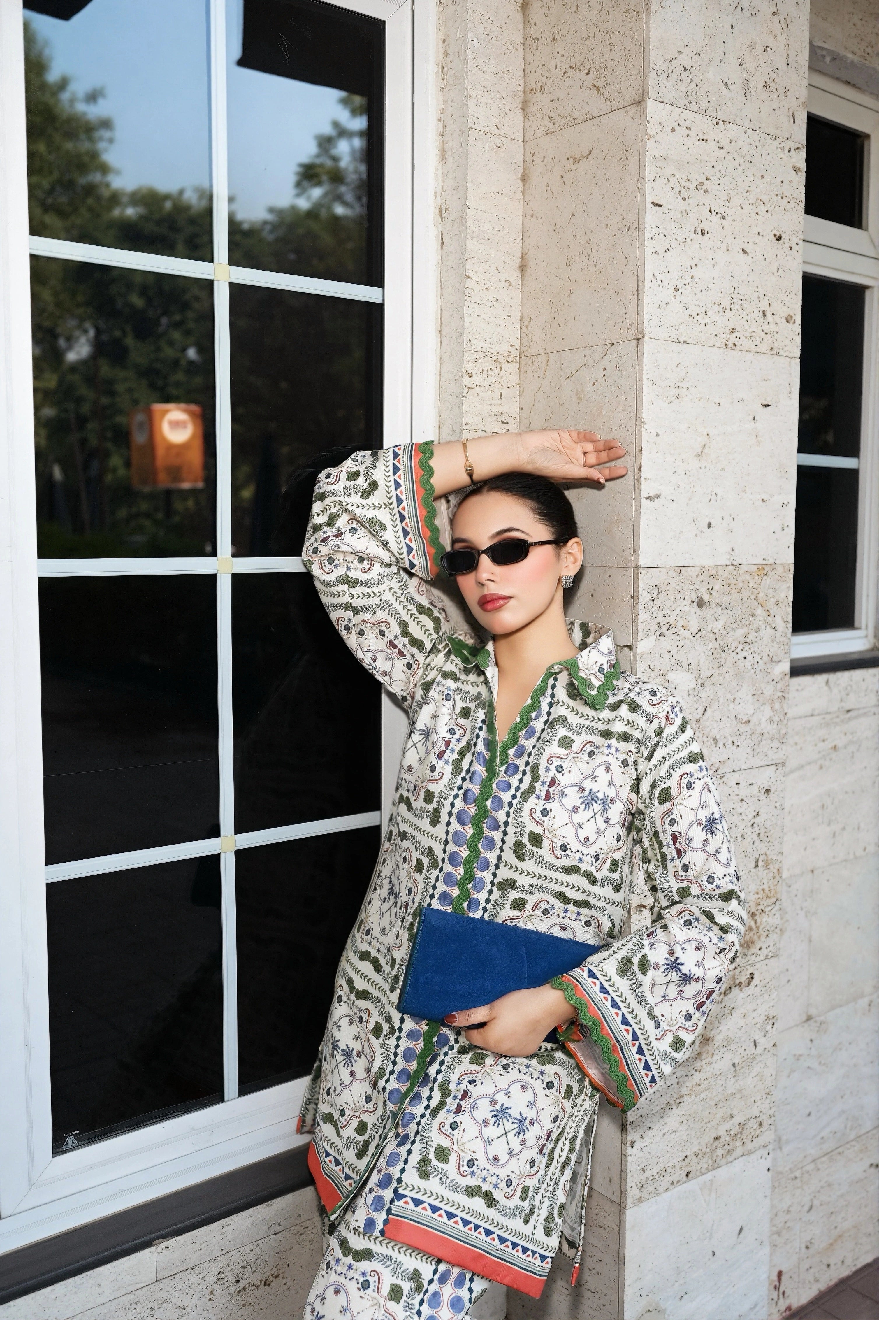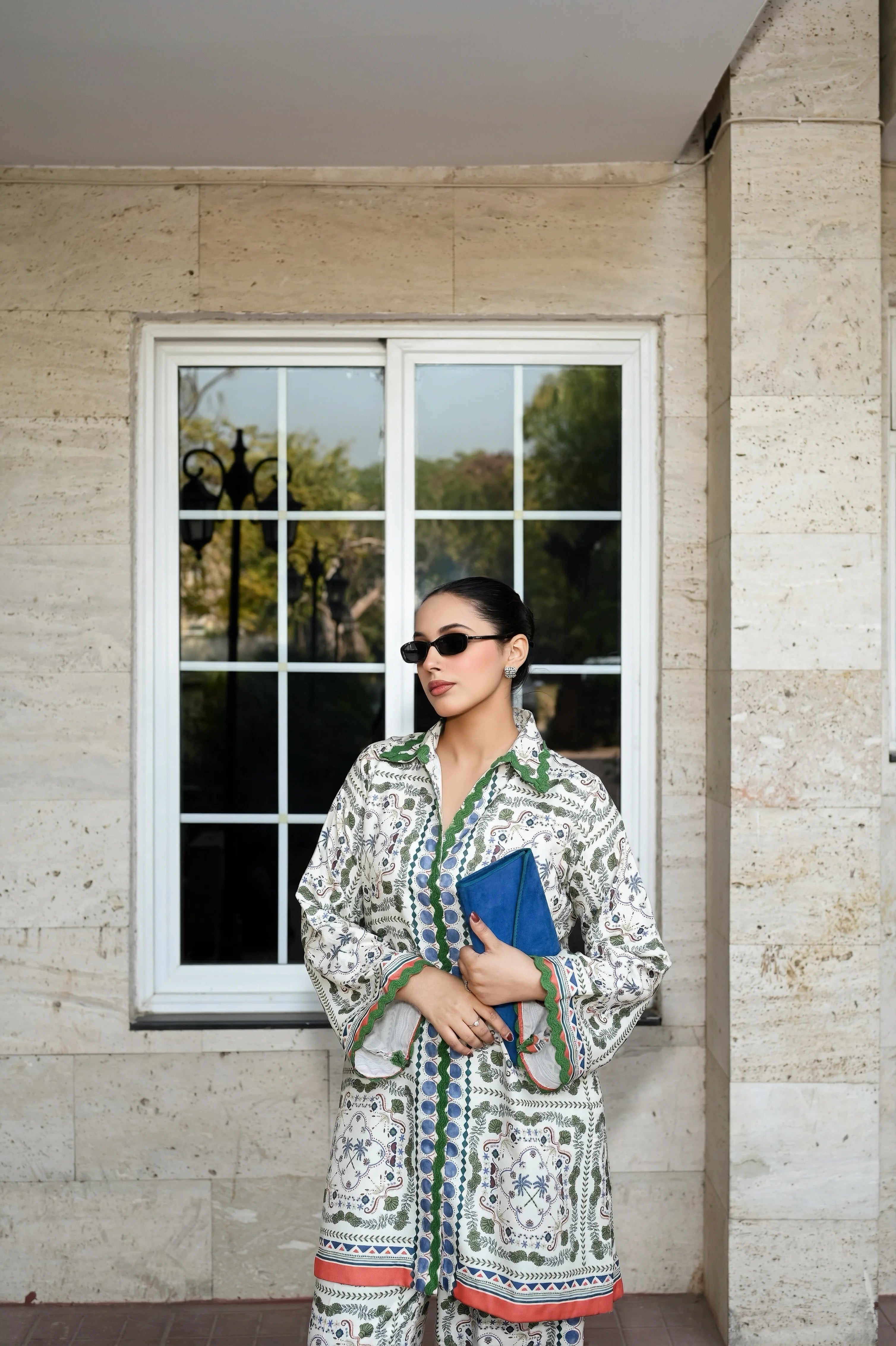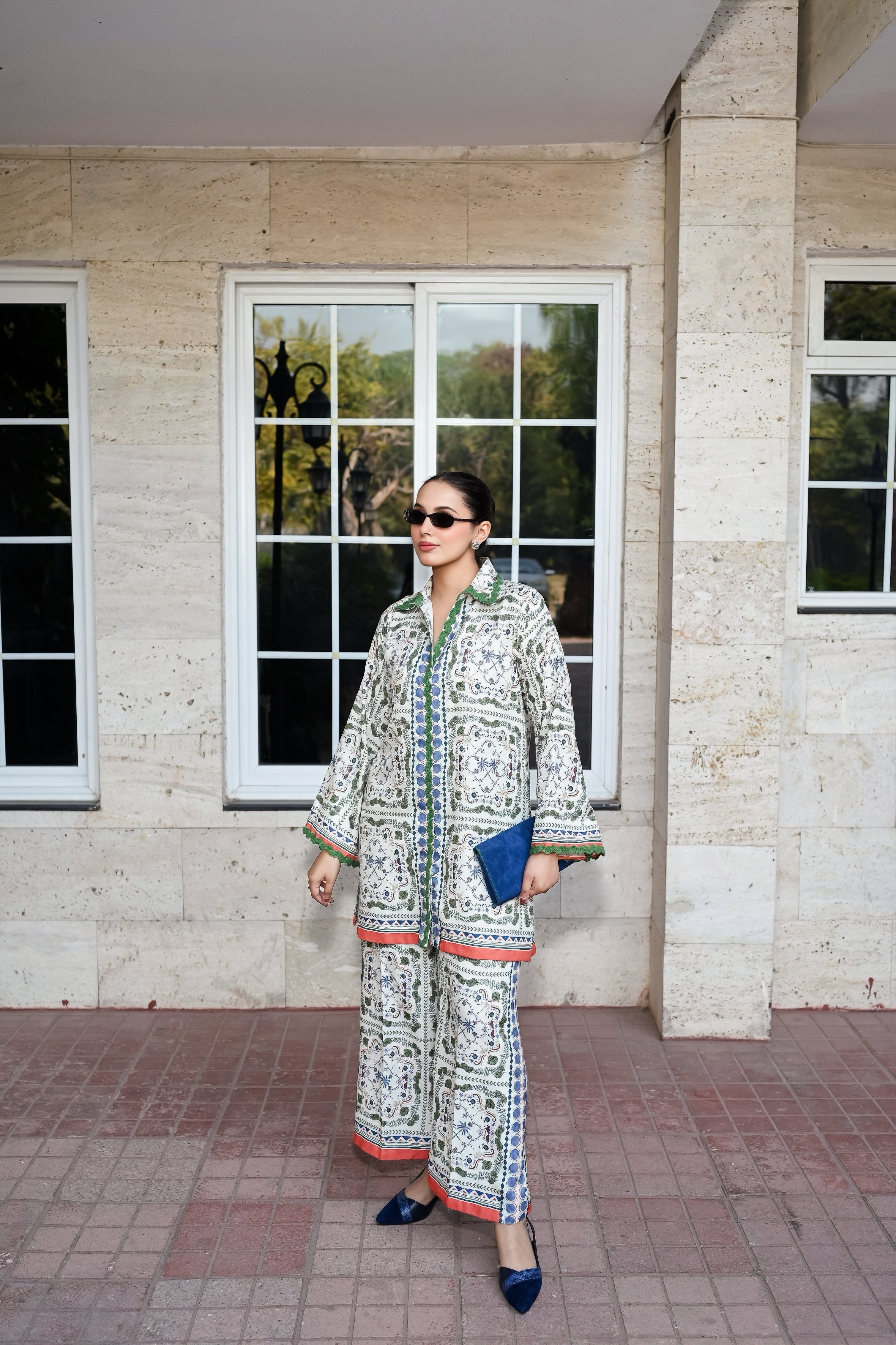 A fun, modern, and ultra-chic co-ord set featuring playful tile-inspired prints, finished with bold green scalloped trims for a fresh vibe. Made from soft, luxury herringbone fabric, it gives you a trendy silhouette that’s equal parts stylish and comfortable.