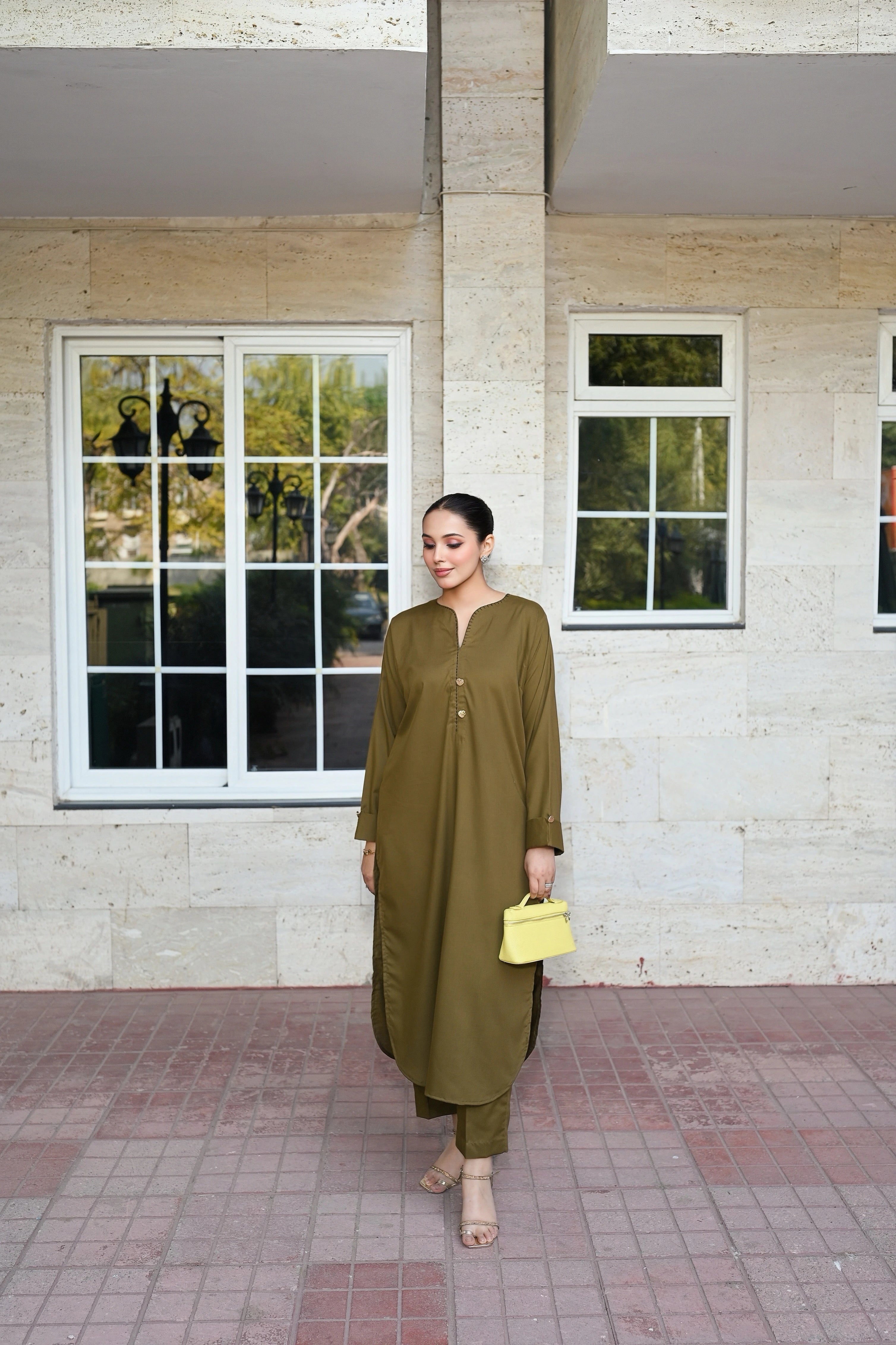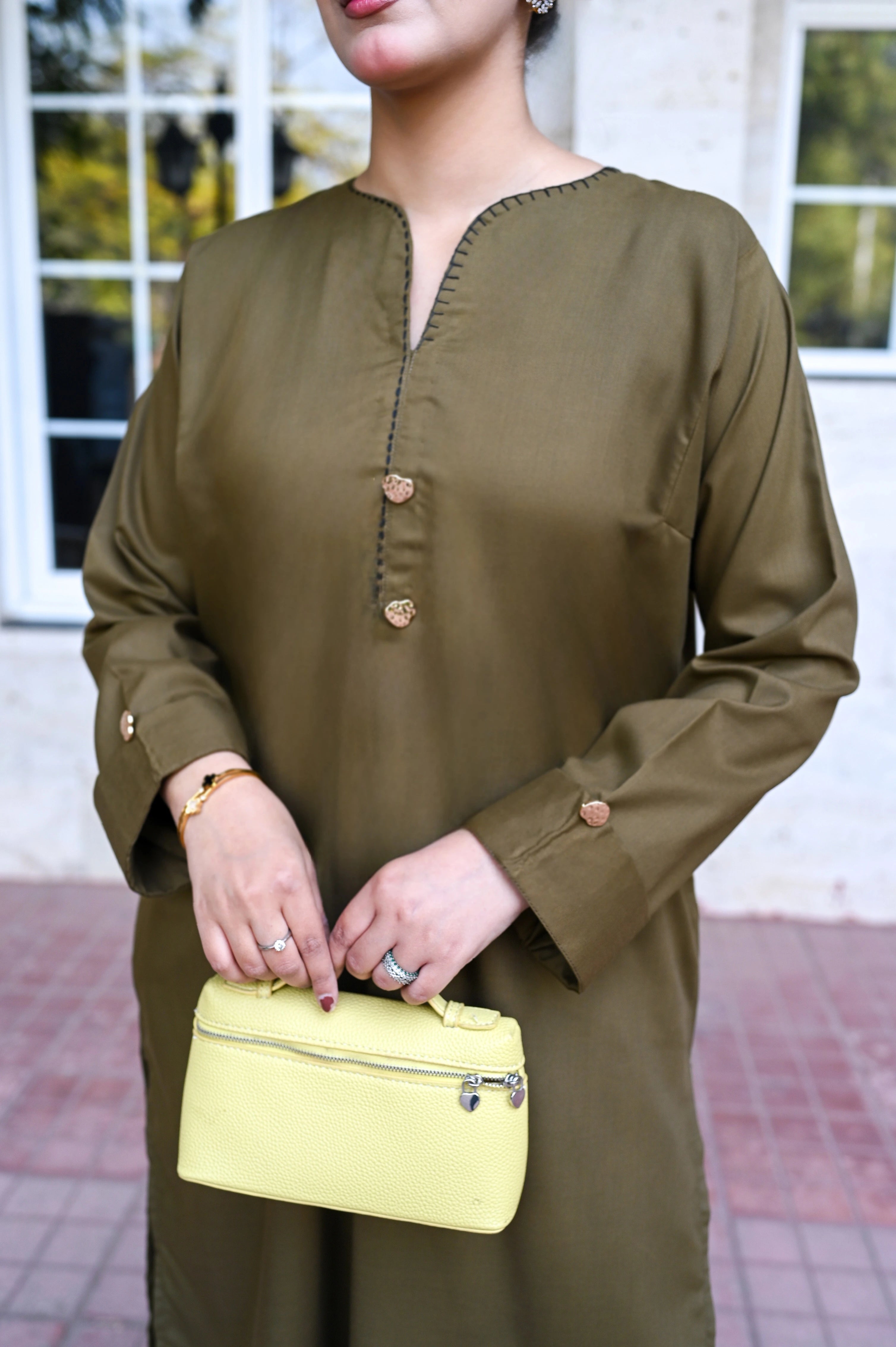 Crafted from our premium blended, wrinkle-free fabric, this two-piece set offers a luxurious drape and a sophisticated hand-feel. The neckline features delicate handwork detailing accented with gold buttons, adding subtle elegance to its clean silhouette. The deep, warm hue creates a versatile and upscale foundation that transitions effortlessly from office hours to evening plans.