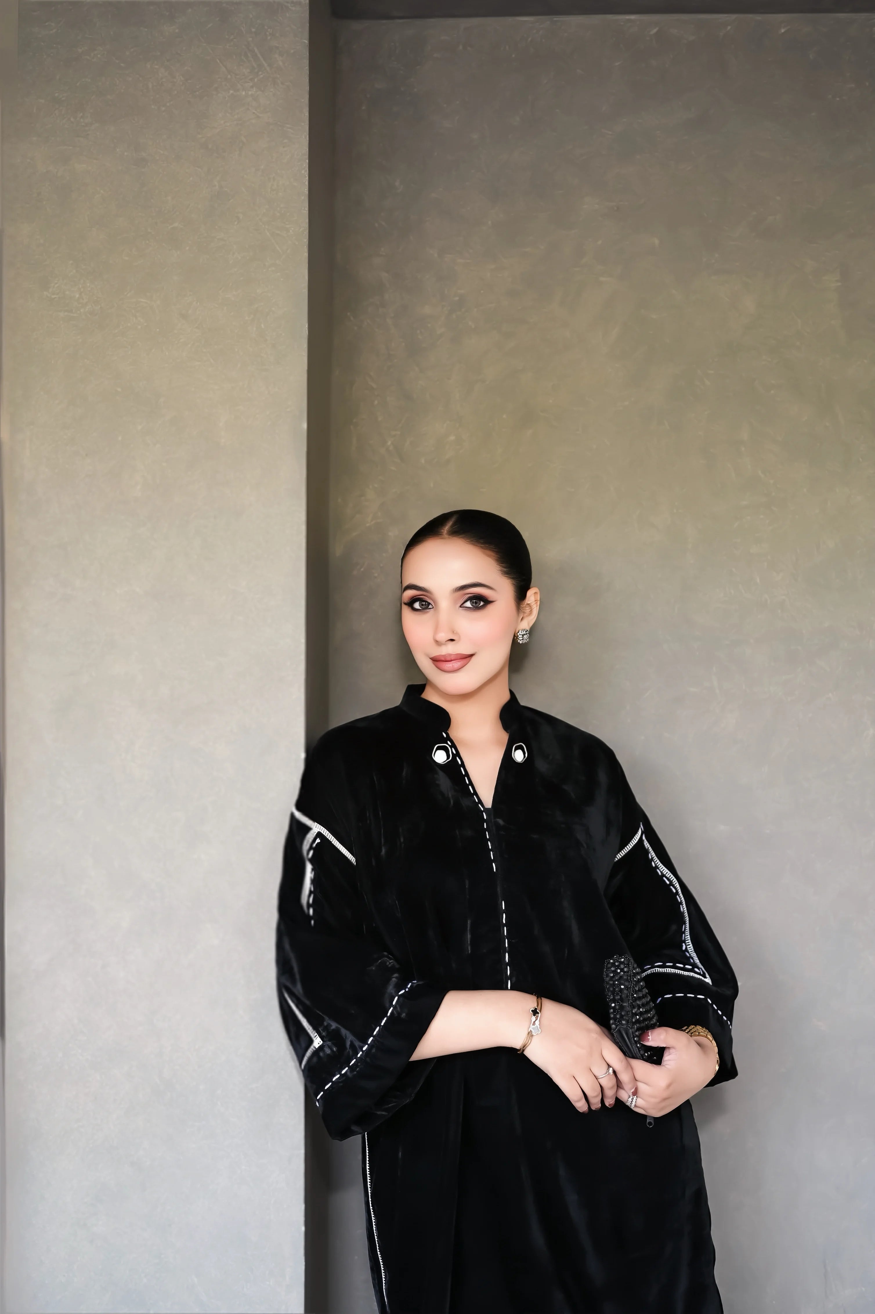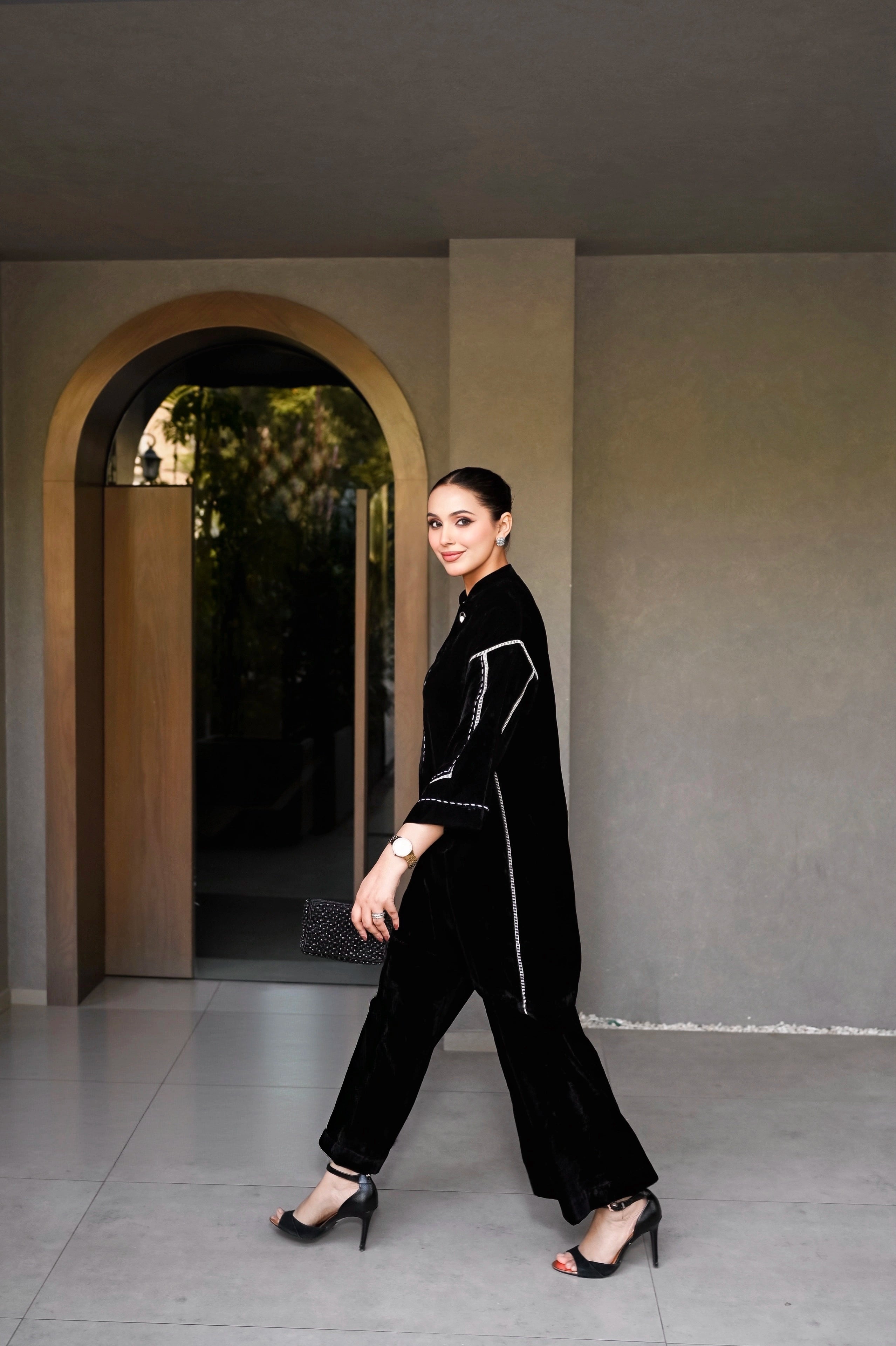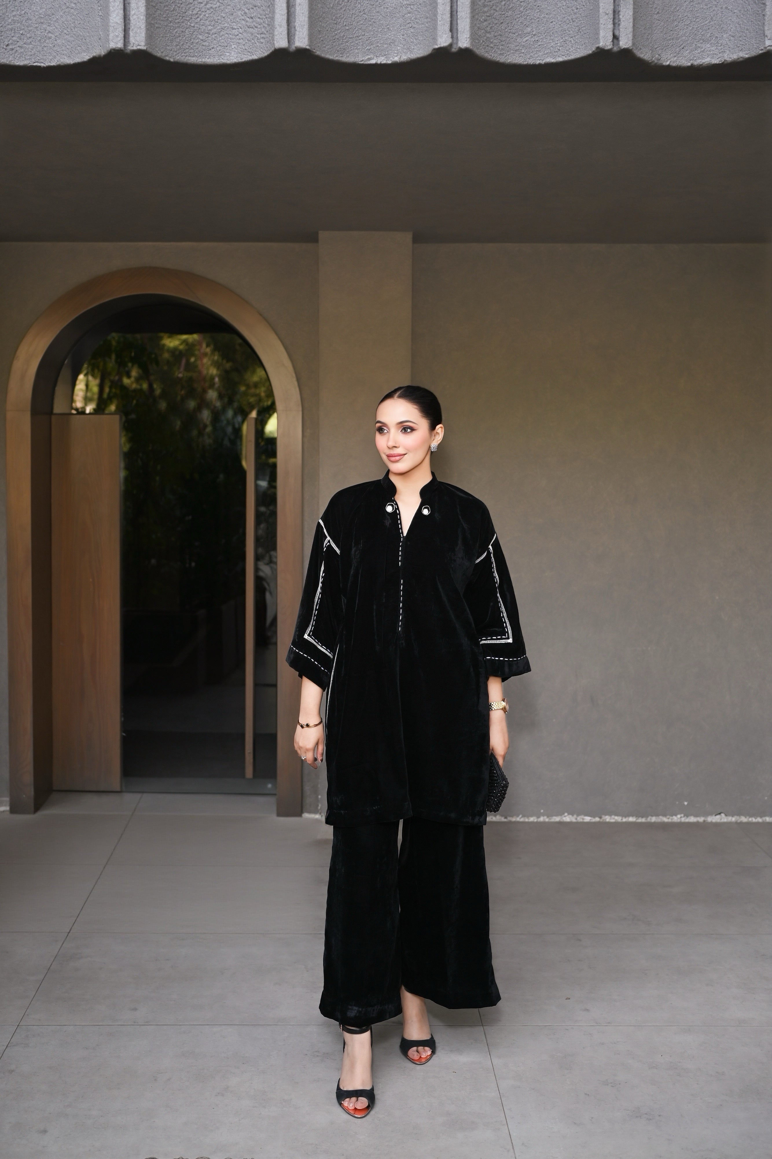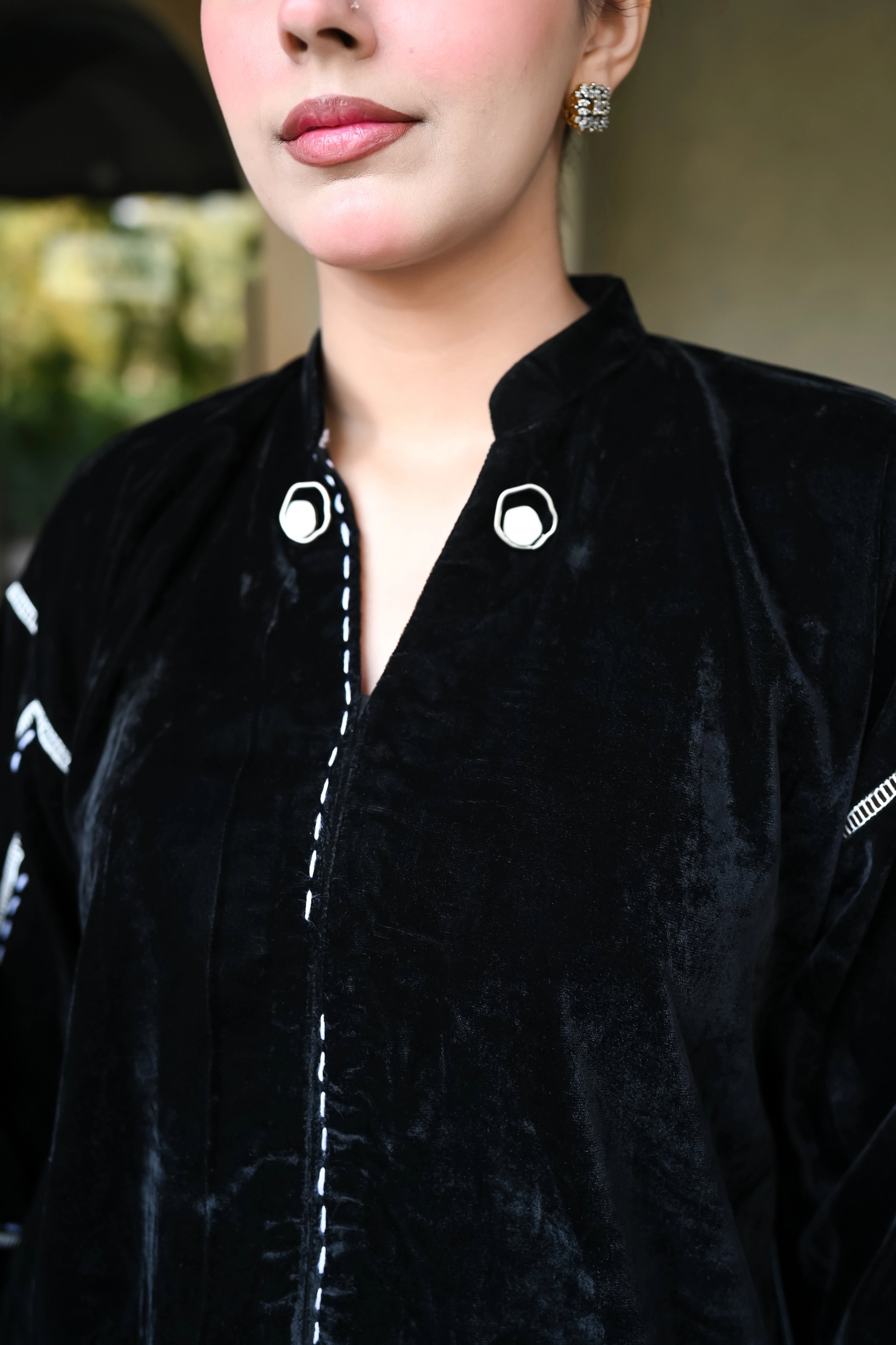 This elegant black velvet 2-piece showcases a soft, luxurious texture elevated with intricate handwork detailing. The neckline features refined hand-stitched contrast accents paired with statement buttons, while the sleeves are adorned with delicate handwork and lace detailing that add depth, craftsmanship, and a touch of timeless charm.