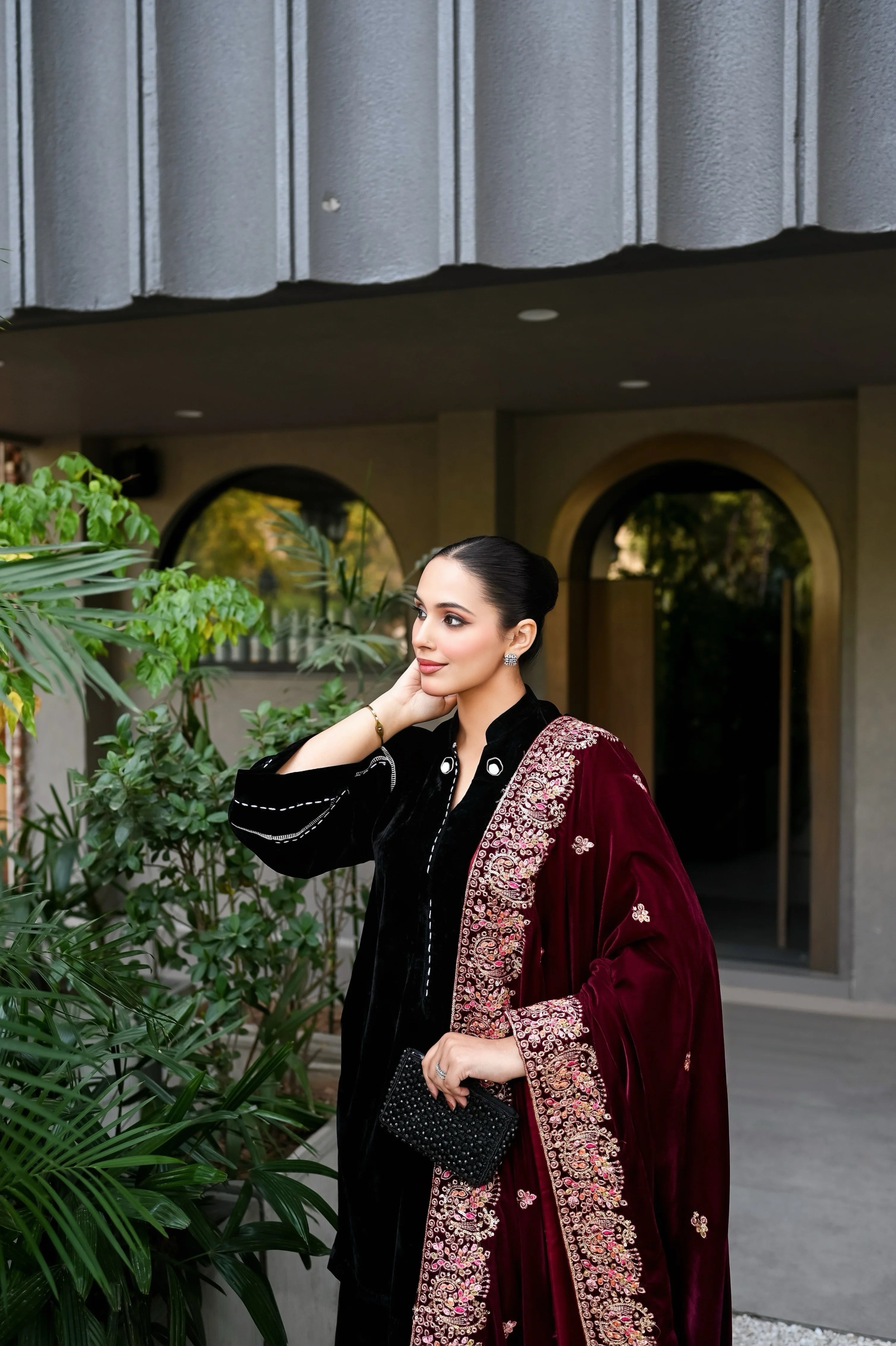 Its sleek design, rich velvet sheen, and flattering drape makes it the perfect choice for winter dinners, festive evenings, and classy night-time gatherings. Elevate the look with our Maroon Embroidered Shawl, a stunning add-on that introduces warmth, richness, and a regal finish to the ensemble perfect for the wedding season.