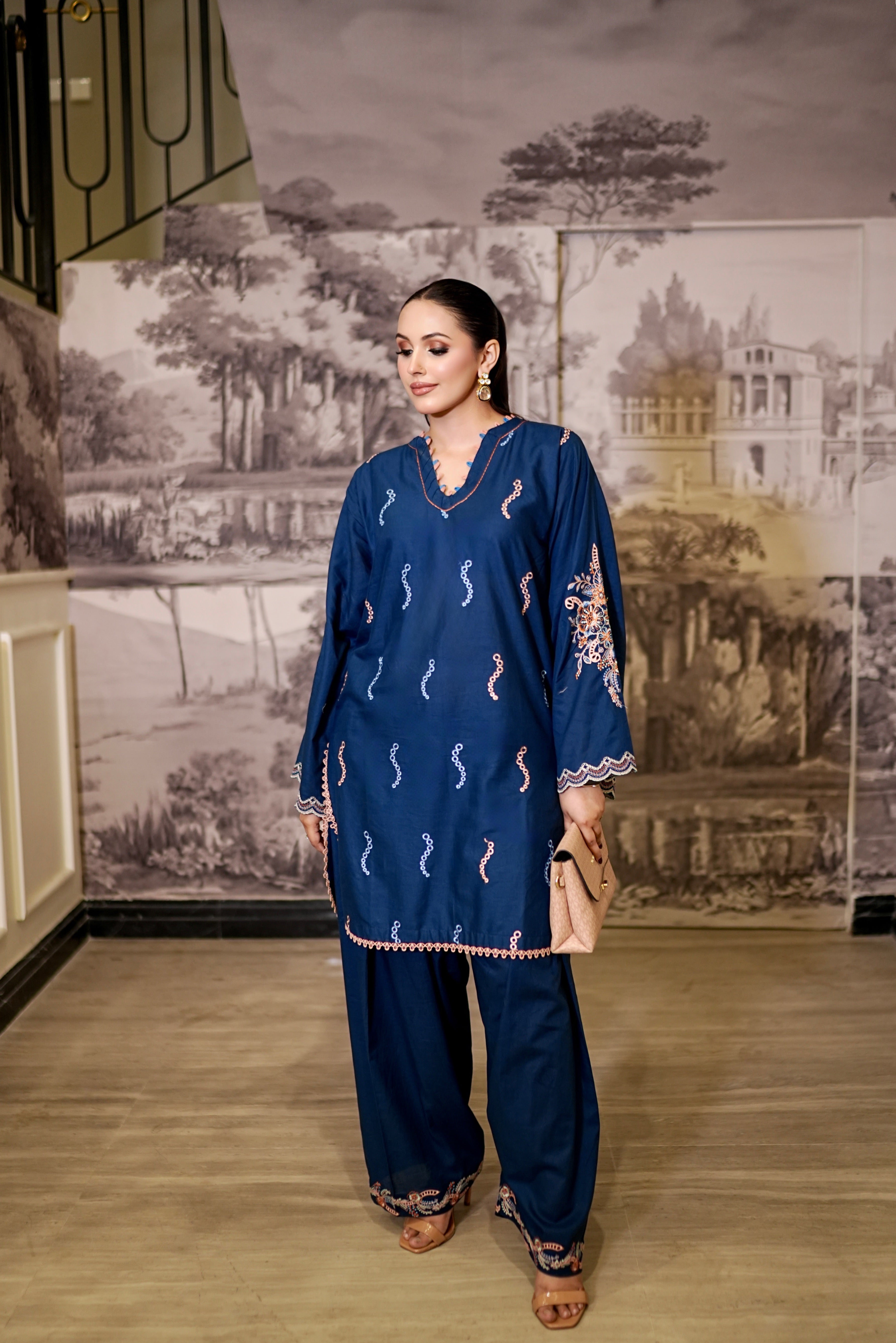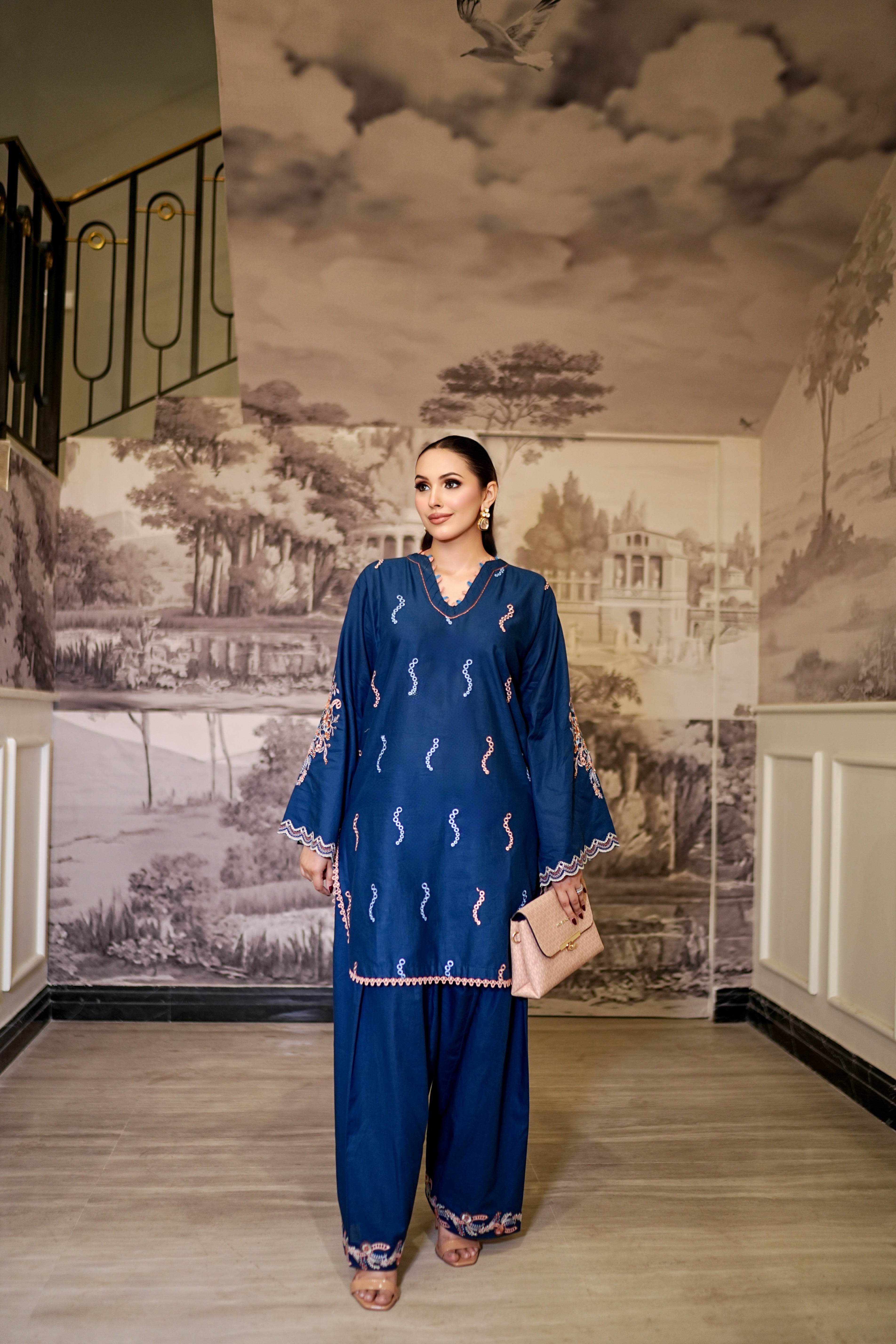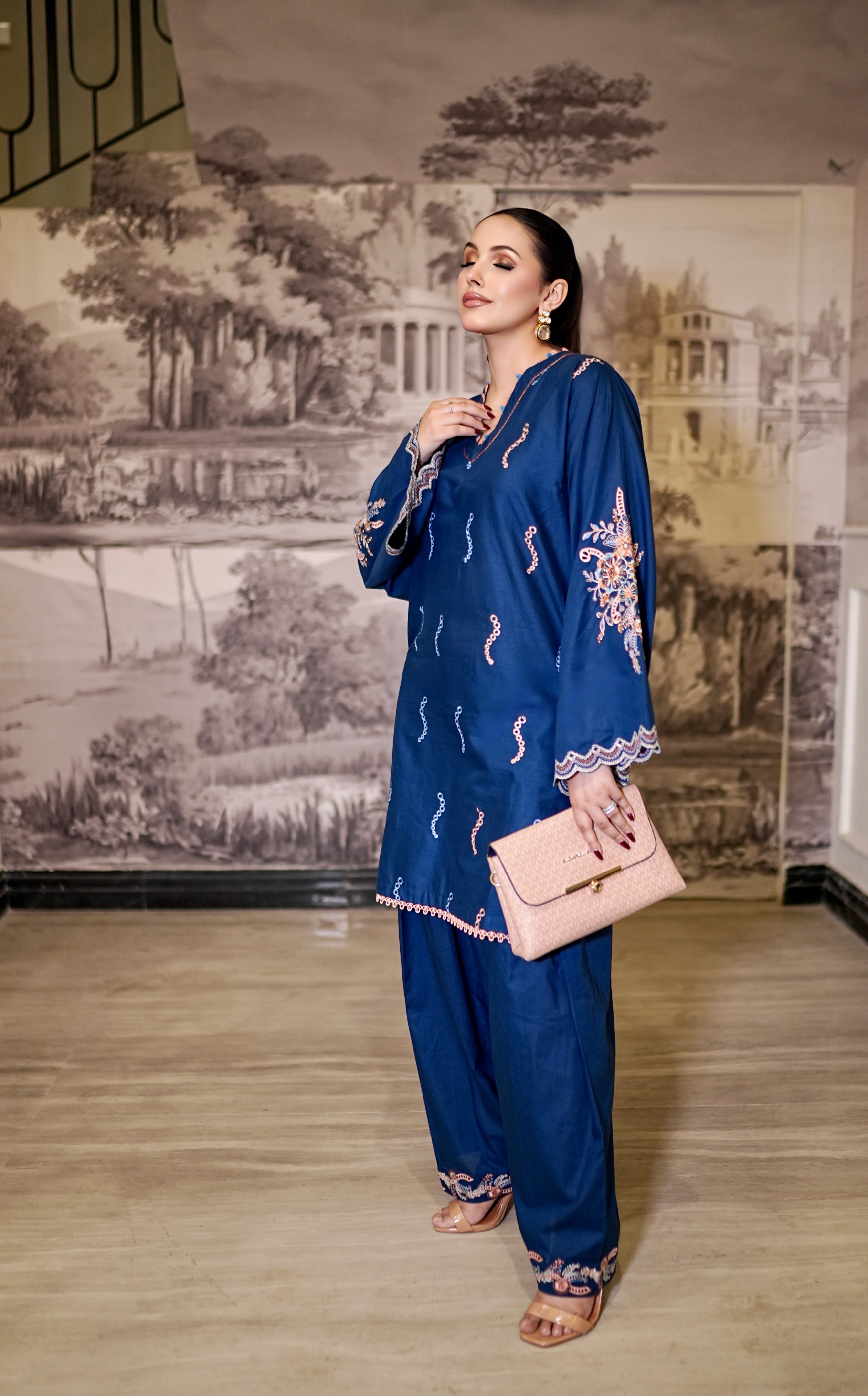 Inspired by the beauty of midnight skies, this rich blue 2-piece is crafted from premium cambric. Soft, breathable, and versatile, it carries subtle textures and elegant detailing. Midnight Veil is a timeless staple that whispers mystery and grace, making it perfect for both day and evening wear.