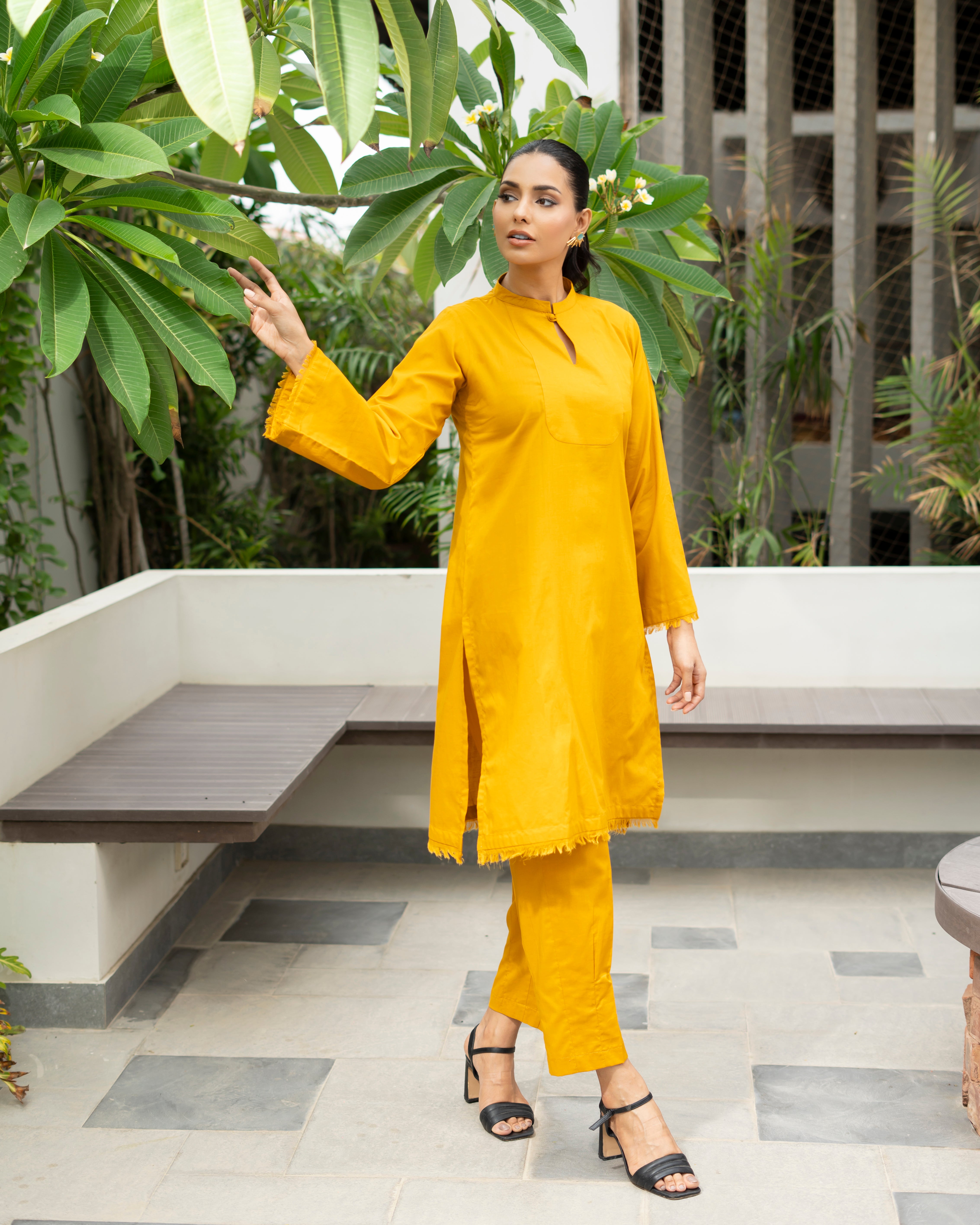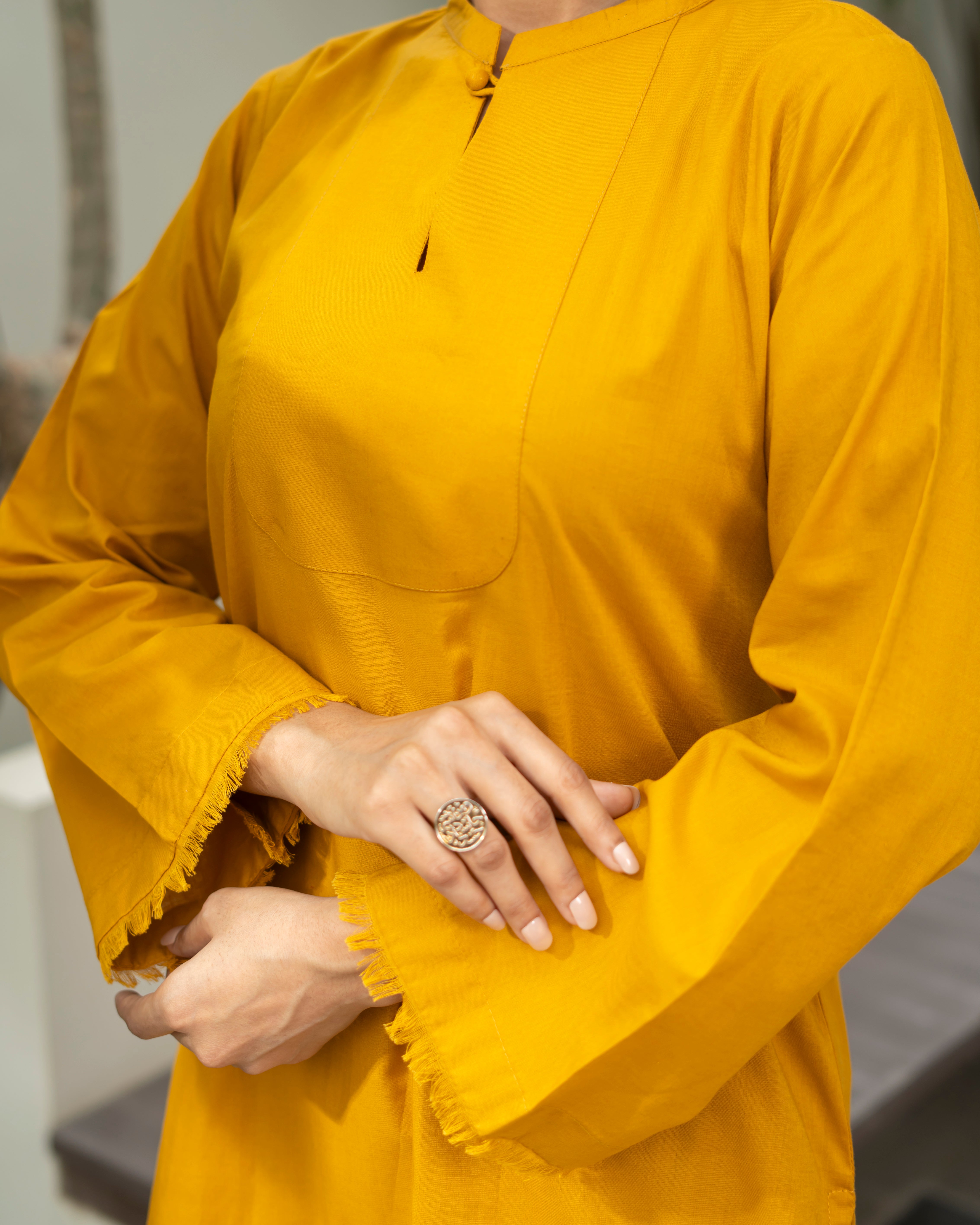 Shauq is a chic two-piece coord set in bold mustard. Crafted from premium cotton, this outfit combines comfort with style. The vibrant hue captures the essence of enthusiasm and zest, making it a standout choice for those who embrace both elegance and energy.