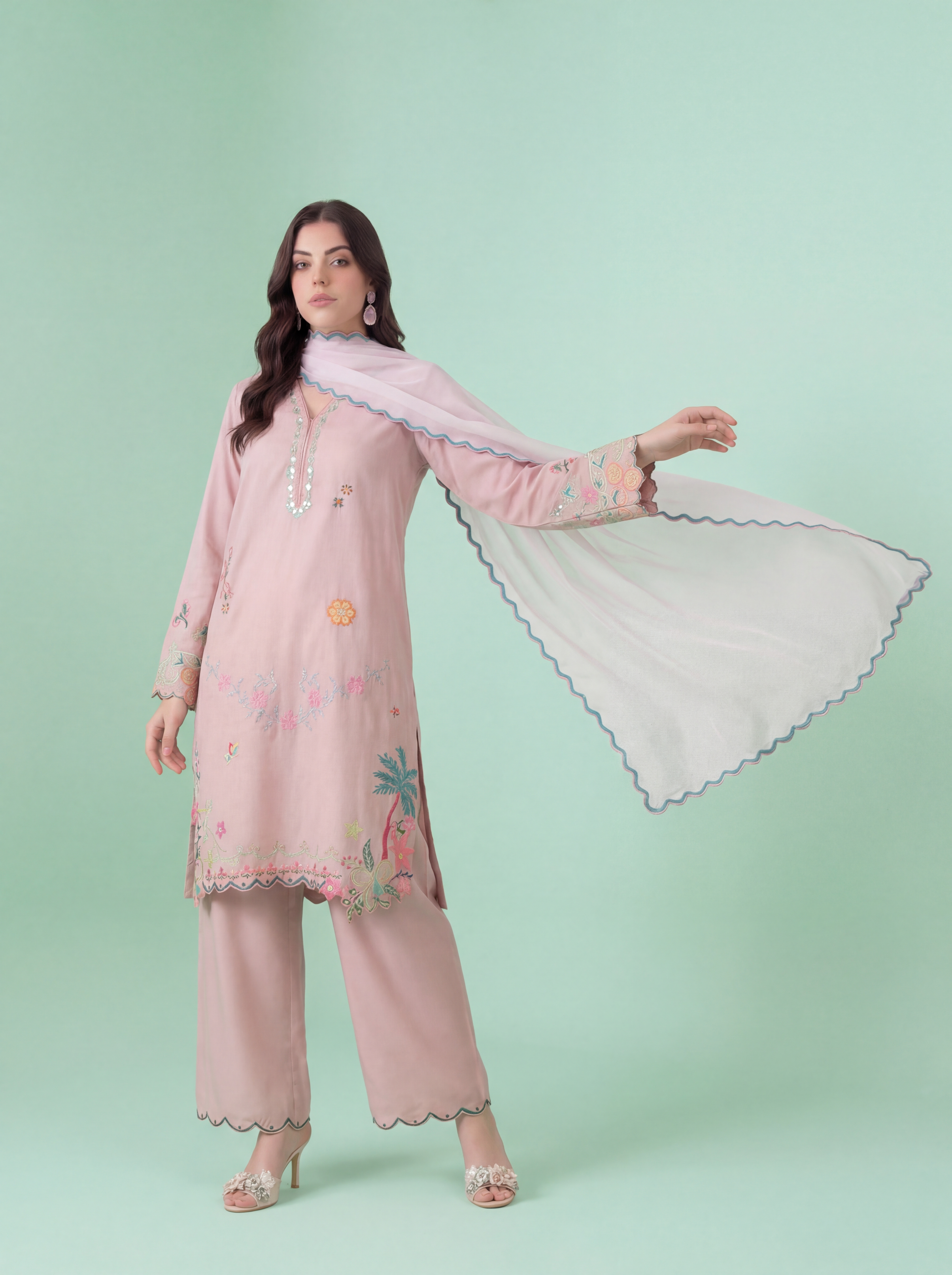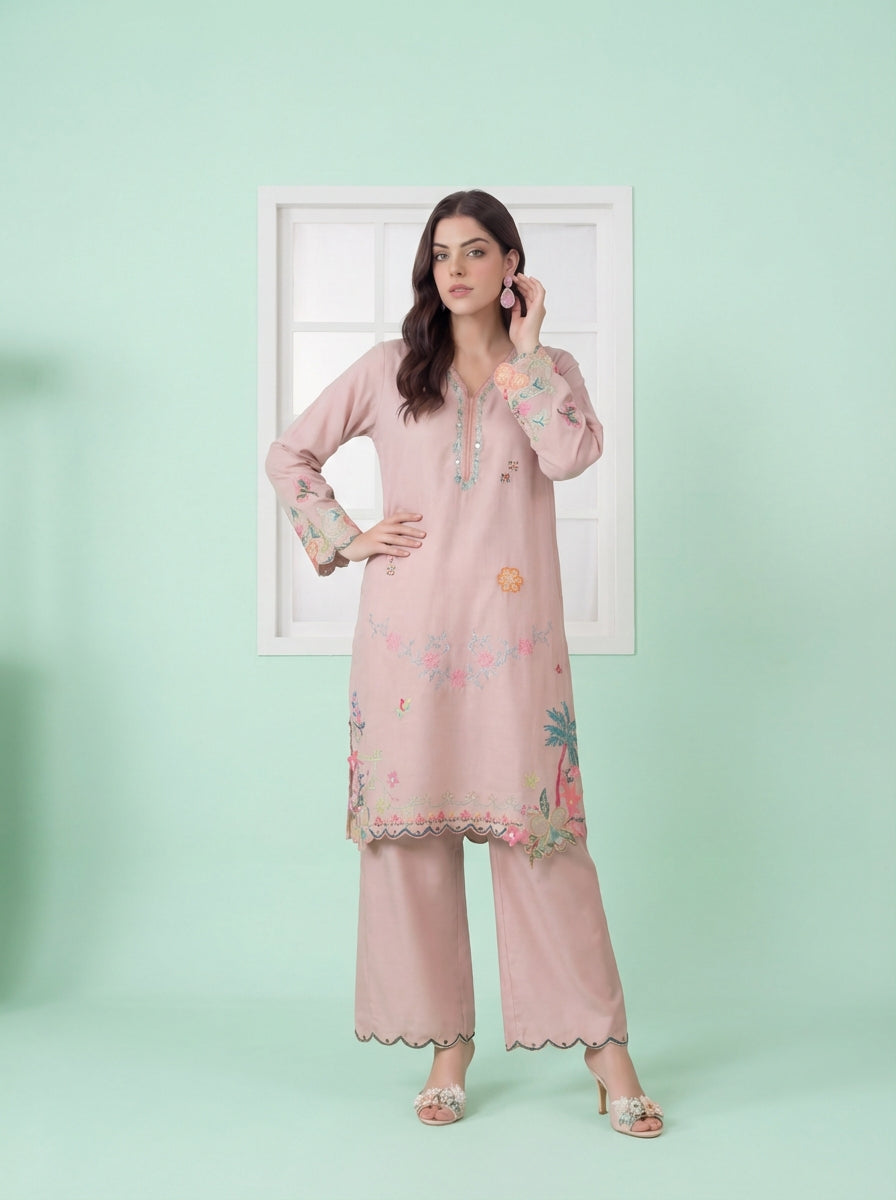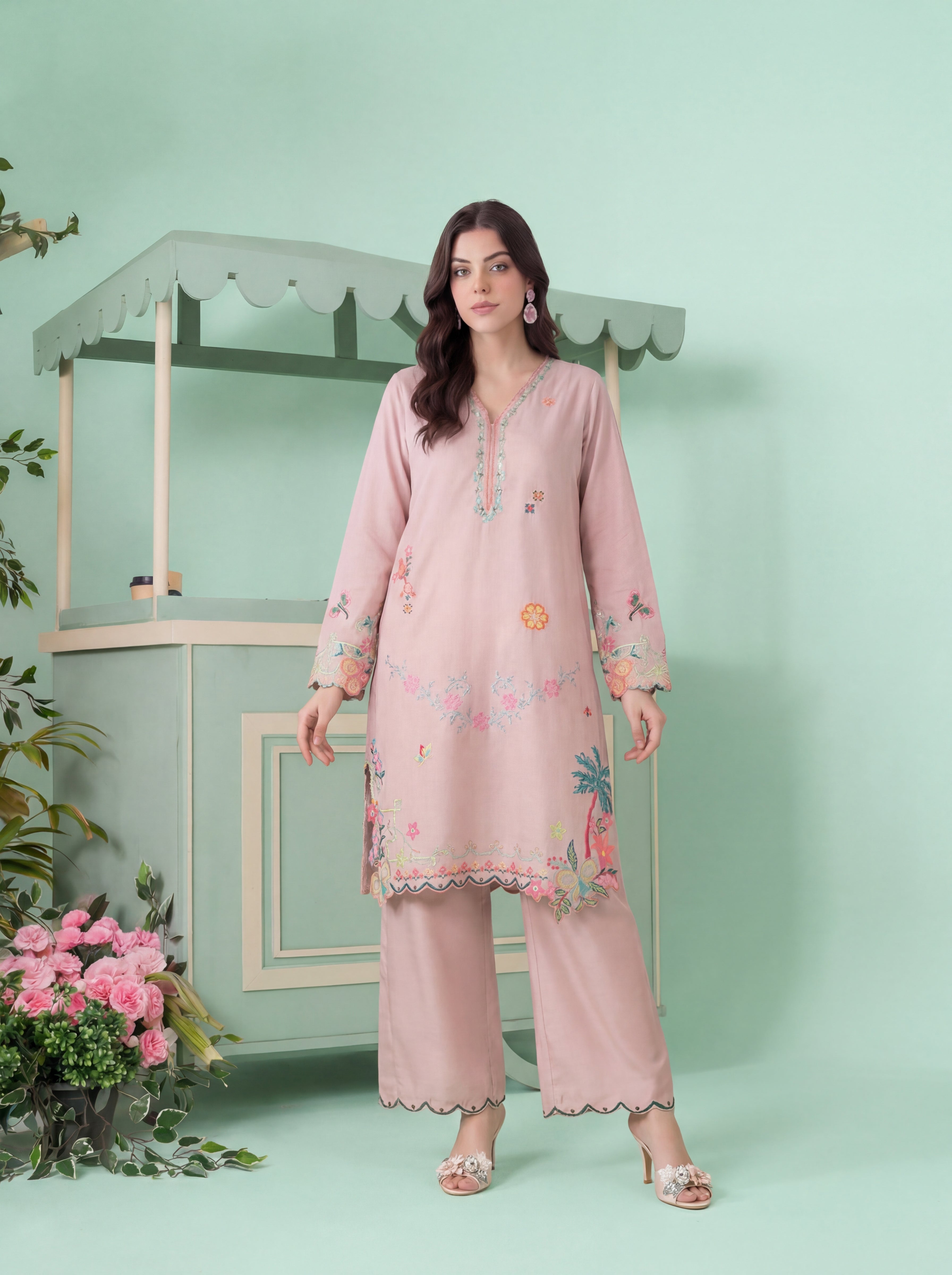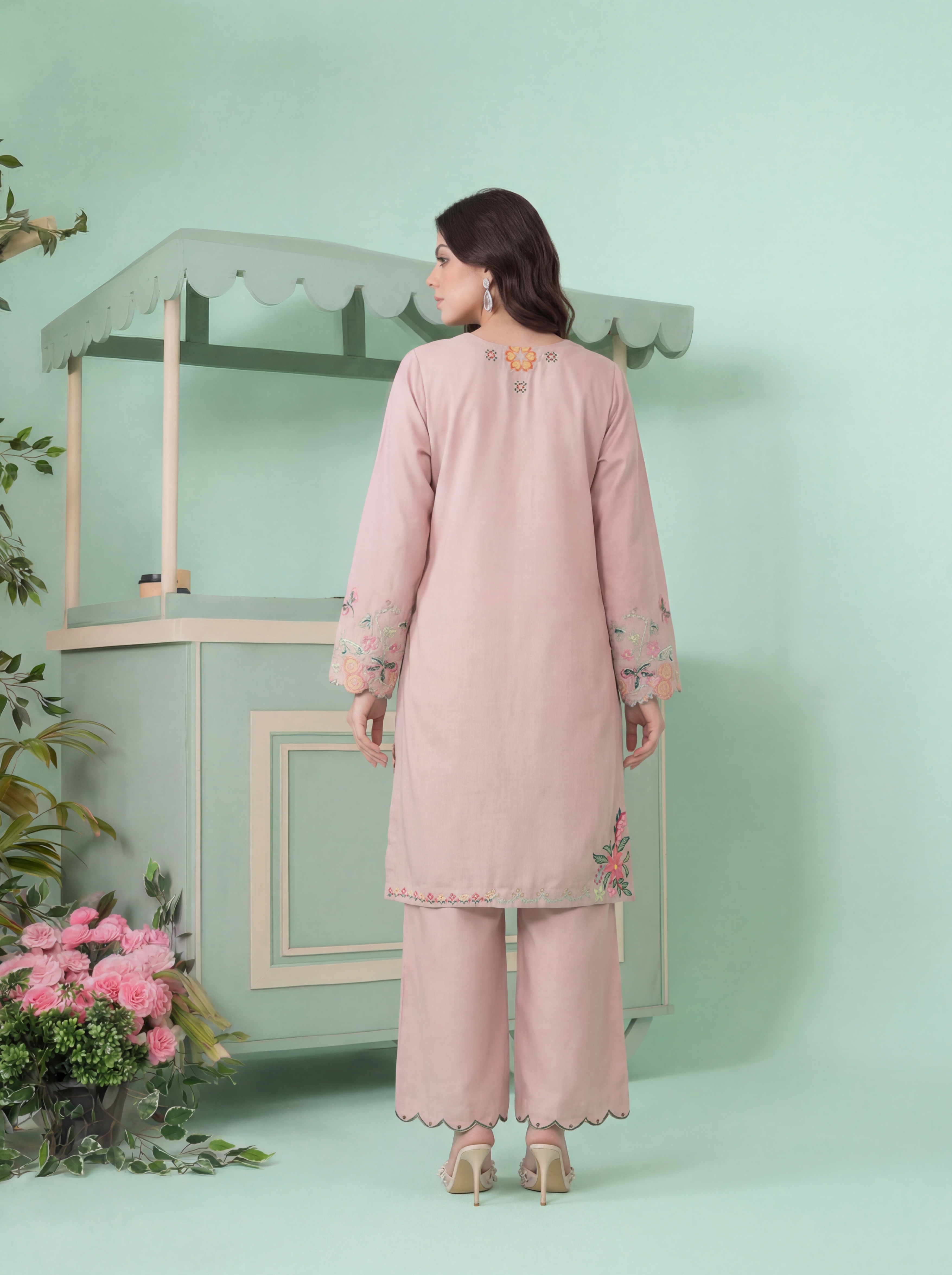 A refined tea pink 2-piece outfit crafted from premium wrinkle-free blended fabric. The kurta showcases delicate machine embroidery in graceful scalloped patterns, lending a soft yet sophisticated charm. Paired with a plain, perfectly coordinated trouser, this ensemble is ideal for effortless day wear and understated occasions.
