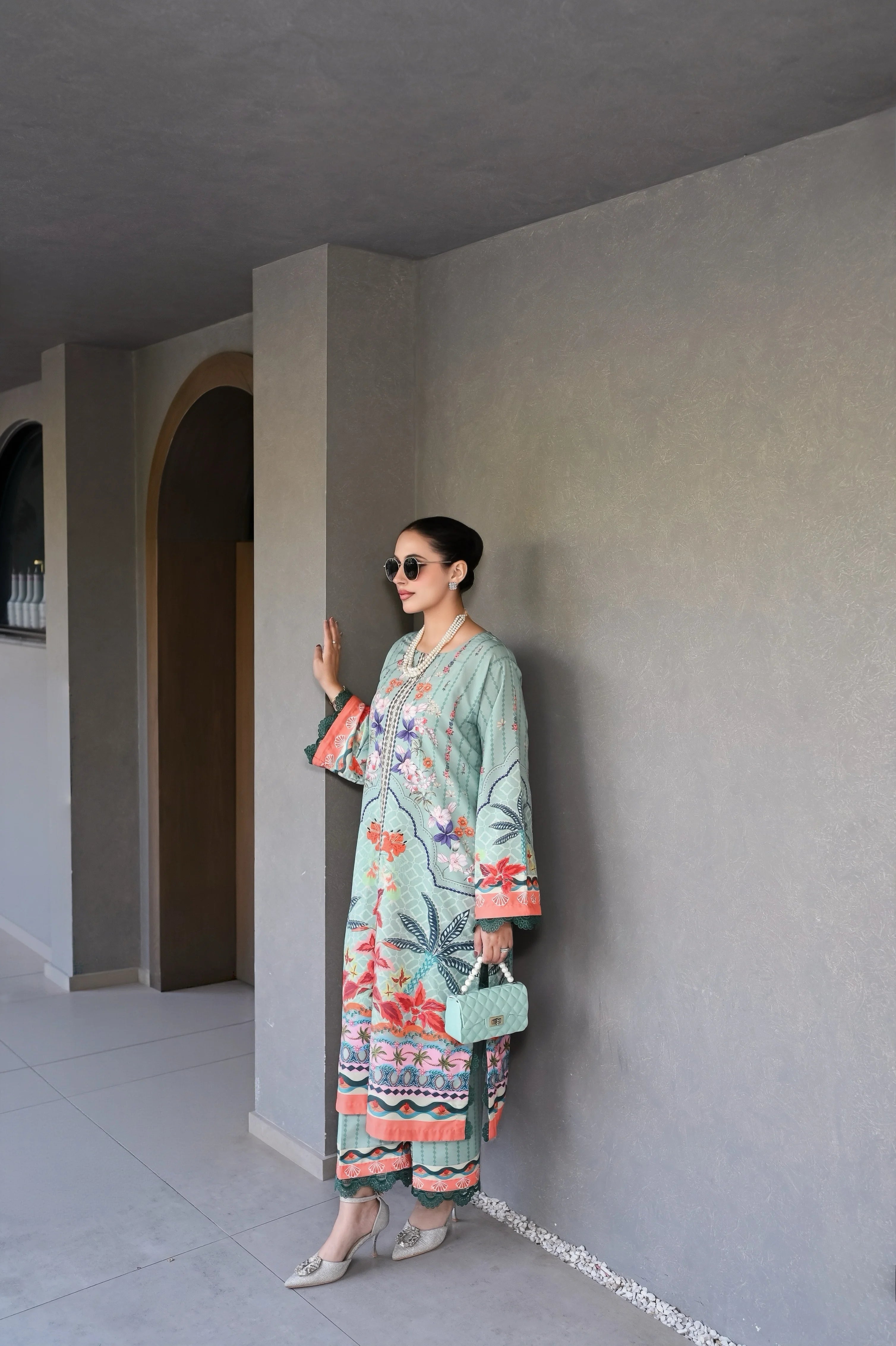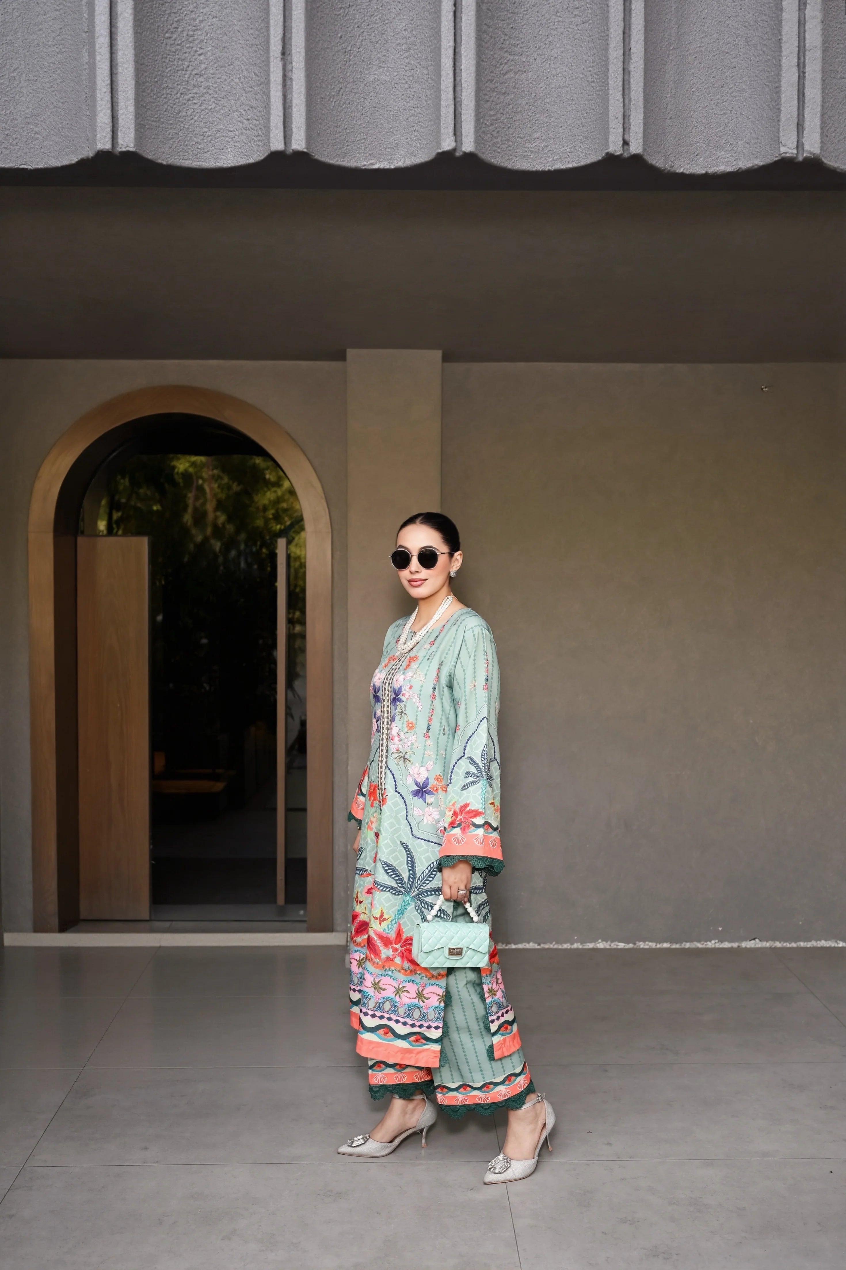 A vibrant 2-piece raw silk ensemble featuring intricate floral and tropical-inspired prints in refreshing aqua, coral, and berry tones. The soft, fluid fabric drapes beautifully, while the detailed borders and lace-trimmed sleeves add a polished, feminine touch.